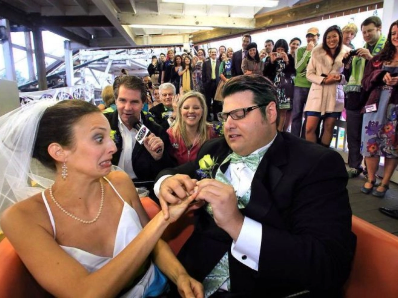 花嫁は結婚について二度考えているように見えます、少なくとも一瞬は。彼女の表情が全てを物語り、これをその日の滑稽なハイライトにしています。