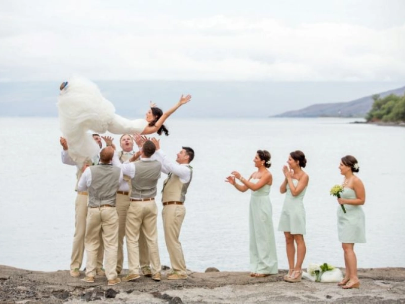 花嫁を崖の近くで投げることがお祝いの一部であるかのようにさえ見えます。この大胆な写真はワイルドな楽しみの瞬間を捉え、見る者を震撼させると同時に楽しませます。