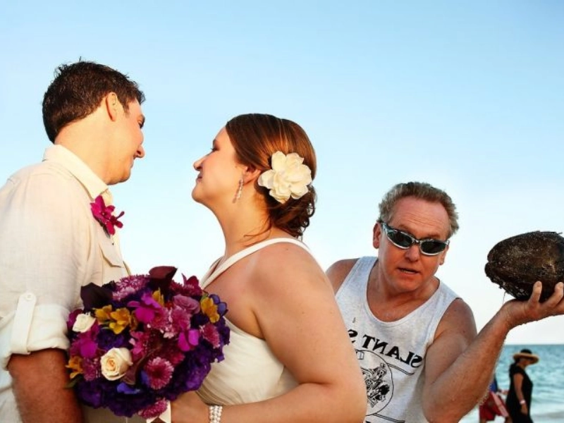 誰かが岩を誇らしげに披露し、予期せぬ発見を共有する瞬間を捉えました。この写真の即興性が結婚式の日の物語に面白いひねりを加えています。