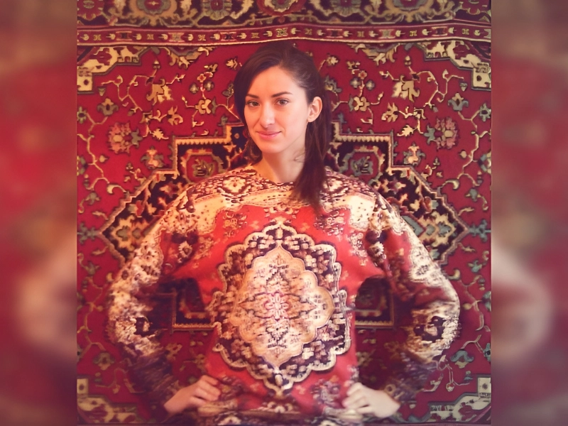 彼女は完璧なラグを見つけました。被写体の服装はカーペットと非常によく一致するため、彼女はほとんどそれに消え、面白くかつ印象的な光景を作り出します。この写真は、時には完璧な一致があなたの足の下にあるという遊び心のある思い出させです。