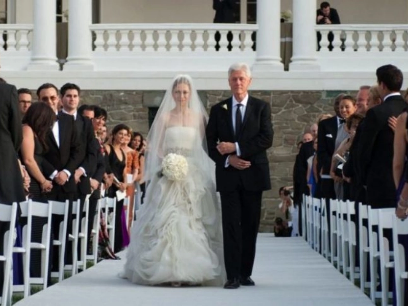 チェルシー・クリントンは2着のヴェラ・ワングのウェディングドレスを着用することで強い印象を与えました。1着目はクラシックなレースが特徴で、2着目は複雑なディテールでモダンな twist を提供しました。両方のガウンは彼女の落ち着きと時代を超越した優雅さへの愛を反映していました。