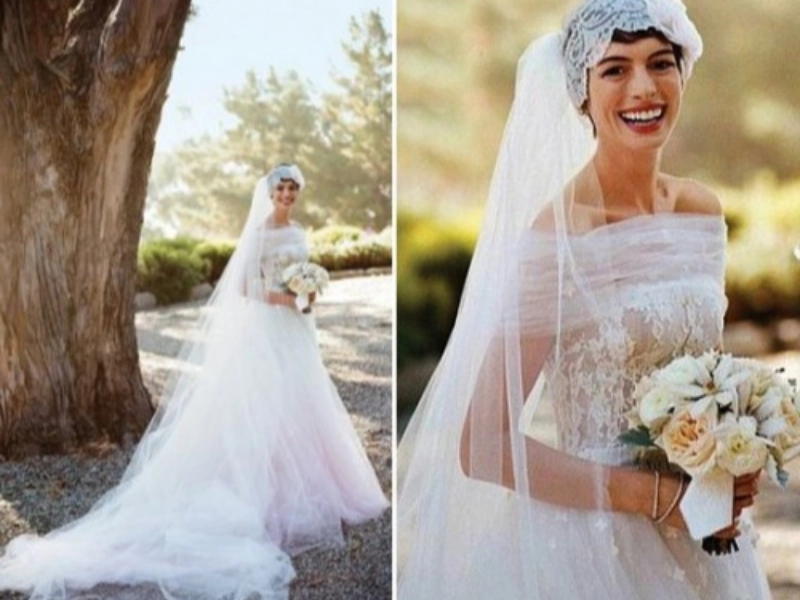 アン・ハサウェイは婚礼にヴァレンティノのガウンを選び、ロマンスと女性らしさを放ちました。ソフトピンクのトレーンとレースのベールが夢のようなタッチを加え、繊細なディテールが彼女の洗練された趣味と時代を超越した優雅さを披露しました。