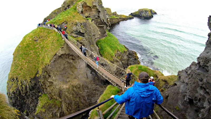 2つの険しい崖の間に吊り下げられたキャリック・ア・レード・ロープブリッジは、下で砕ける波の100フィート(約30メートル)上に伸びています。この狭く揺れる橋を渡ることは鼓動が早くなる体験です。特に下を覗き込み、古代の洞窟や岩の露頭を見つけようとする勇気ある人々にとってはなおさらです。眺めは忘れられませんが、無防備な感覚は現実のものです。