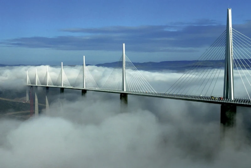 タルン川渓谷を見下ろすミヨー高架橋は、工学の傑作であり現代フランスの象徴です。谷底から1,125フィート(約343メートル)の高さに位置し、世界一高い橋として、その細い橋脚は雲に届きます。橋からの眺めはまさに壮観ですが、高所恐怖症の方にとっては渡ることが神経の真の試練となるかもしれません。風景の遥か上空を滑空する感覚は、足元には細い道路、周囲には広大な空だけという、スリリングでありながらも気が遠くなるような体験です。