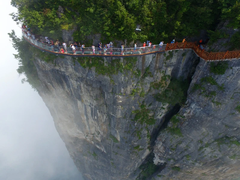 世界の遥か上空で、天門山スカイウォークは天門山の断崖絶壁に驚異的な高さ約4,700フィート(約1,433メートル)で張り付いています。このガラス張りの床の橋は幅わずか3フィート(約91センチ)しかなく、真下の谷底への目眩がするような眺めを提供します。ここを歩くことは鼓動が早くなる冒険であり、息を呑む景色とアドレナリンラッシュの両方を求めるスリル seeker に最適です。空中に吊り下げられた透明なパネルの上を歩く一歩一歩があなたの勇気を試します。