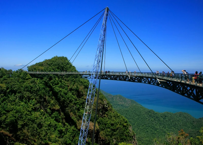 熱帯雨林の遥か上空に吊り下げられたランカウイスカイブリッジは、現代工学の驚異です。この歩行者用橋は、単一の橋脚とケーブルで支えられ、海抜2,170フィート(約661メートル)で樹冠の上を優雅に曲線を描きます。歩道に到達するには、傾斜したエレベーターに乗らなければならず、冒険感が増します。パノラマビューは忘れられませんが、細いスパンを横断する間、眩暈は常について回る同伴者です。