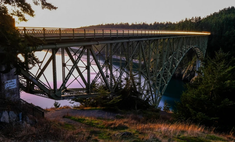 霧と神秘に包まれたディセプション・パス橋は、ワシントン州のウィッドビー島とフィダルゴ島を結んでいます。しばしば霧に包まれるため、数フィート先を見ることさえほぼ不可能になることがあります。下で渦巻く水流と急な落下がサスペンス感を増し、渡橋の度に未知への冒険となります。