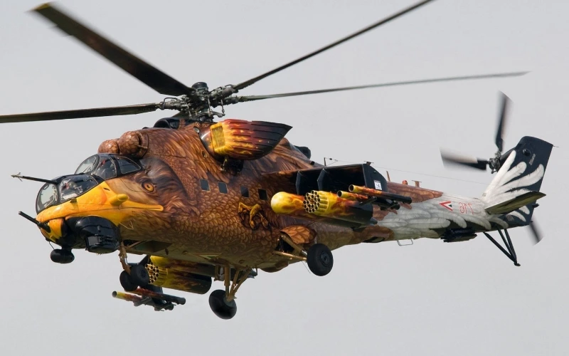 ハンガリー空軍のMi-24V ハインドヘリコプターは、カスタムの鷲の塗装スキームによって変貌を遂げています。デザインは尾から機首まで伸び、飛行中の猛禽類の錯覚を作り出します。羽、目、くちばしの複雑な細部は並外れた芸術性を示しています。 earthyな色合いがその凶暴な外観を強化し、迷彩は戦術的利点も提供するかもしれません。この塗装は国家的誇りと軍用航空において可能な芸術性の両方を称えています。