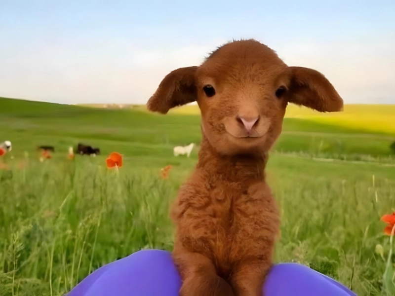 この魔法のような画像は、写真家の脚の上で休む可愛い茶色の子ヤギを捉えています。色とりどりの花と新鮮な草に囲まれ、近くで牛が草を食む様子は、平和と魅力を放っています。