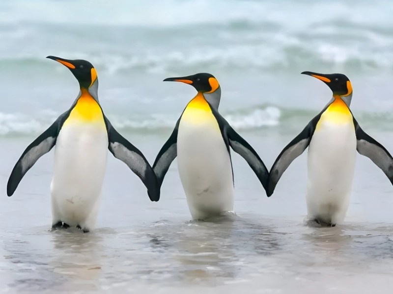 この甘い画像は、ビーチ沿いを歩き、互いの翼をつなぎ合う3羽のキングペンギンを映しています。動物と人間の関係の類似性を強調し、2023年コメディ野生生物選集に選ばれました。
