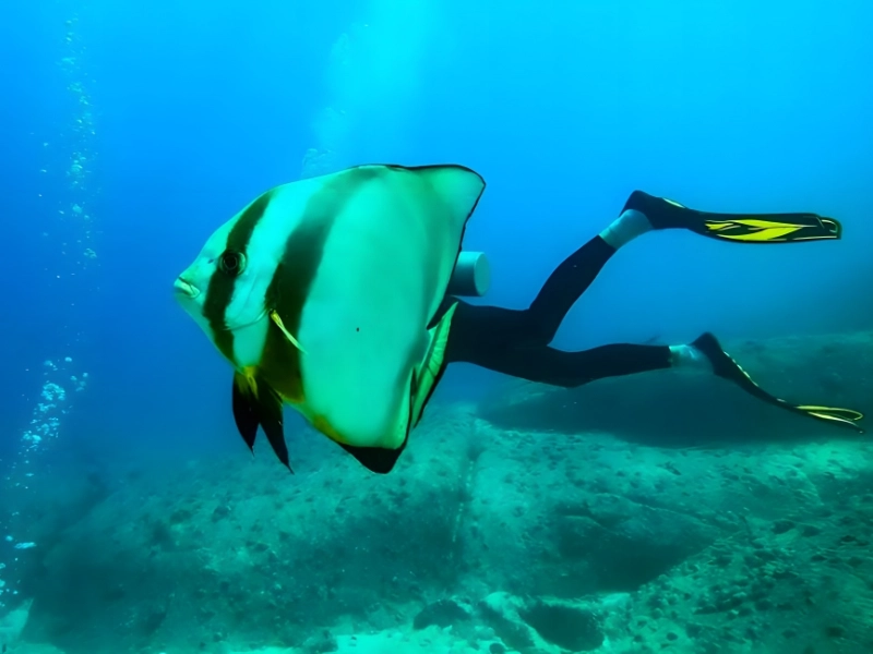 この楽しい画像では、Danielleのダイビング仲間の一人が前方を泳ぐバットフィッシュによって隠され、人魚の錯覚を作り出しています。新人ダイバーにとってなんてラッキーショットでしょう!