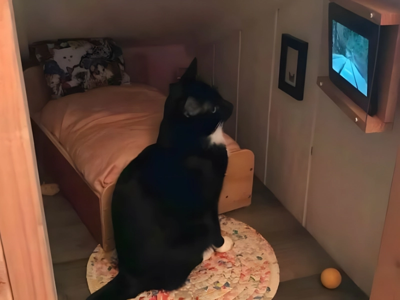 この愛らしい猫は、階段の下に自分専用のスペースを持っています。ハリー・ポッターの部屋のようですが、はるかに豪華です。エリアには丸いラグ、遊び心のあるボール、小さな写真立て、そして猫をモチーフにしたクッションが付いた居心地の良いベッドがあります。見どころは?テレビです!