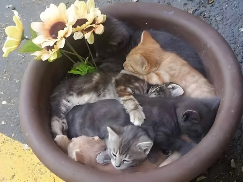 すべての猫の飼い主は、猫が突然現れて最も予想外の場所であくびをする瞬間を知っています。この楽しい写真は、丸まった猫たちで満たされたポットを特徴として、その嬉しい驚きを完璧に示しています。