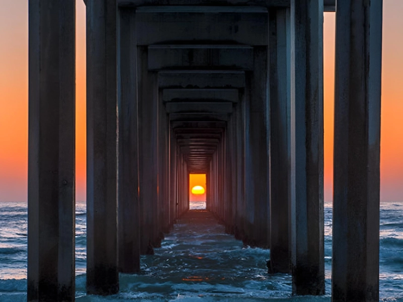 息をのむ夕焼けの写真 夕焼けを撮影することは難しいかもしれませんが、この画像はその輝きを美しく捉えています。年に2回、太陽はカリフォルニア州ラホヤのスクリップス桟橋と完璧に並びます。写真家のジョン・H・ムーアはこの珍しい配置を捉えることに成功し、同じことを試みる多くの人々の中で際立ちました。彼の技術がこの夕焼けの光景を真に驚くべきものにしています。