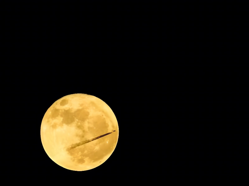 月が空を支配するにつれて、飛行機からのはかない跡はその輝きを増します。この魔法のような光景は、閲覧者に輝く月を背景に夜を飛び回る魔女の夢を見るよう誘います。