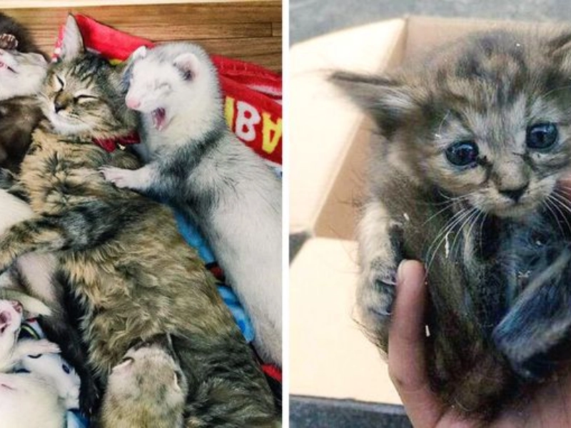 小さな迷子のコマリは弱々しく不安そうに到着しましたが、5匹の活発な雄フェレットの一団にすぐに包まれ、彼らは優しい好奇心を持って接しました。彼らの遊び心のあるトンネルチェイスや共同の昼寝は彼女の社交学校となりました。自分をイタチ科の兄弟の一員だと思い込み、彼女は彼らのふざけた真似をしてから、それらを独特の猫の優雅さと融合させました。今でも、成長して自信を持った彼女は、午後の昼寝に彼らの温かい集まりを求めており、家族は血縁ではなく愛情によって形成され得ることを証明しています。