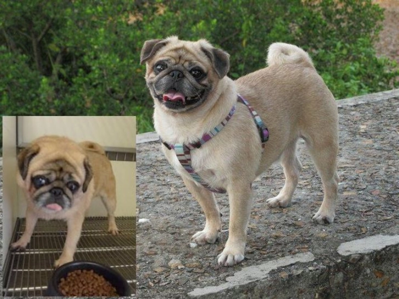 パッチーズの初期の写真は、まだ適応中のパグを示しており、目は少し不安そうです。後のフレームは、自信に満ちた伴侶が安堵を放ち、体重が安定し、表情が柔らかい様子を特徴としています。誇らしげにオンラインで共有されたこの対比は、忍耐、構造化されたケア、そして愛情が、残されたペットから家族の中心メンバーへとアイデンティティを再構築できるという静かな証拠を提供します。