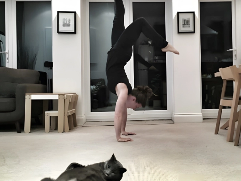 この猫は下向きのポーズをしています!飼い主がヨガをしている間、猫は自分自身の動きを披露しています。人間は猫を恥ずかしがらせているのかもしれません、猫は以前ヨガをしたことがないように見えます。それでも、試みることが最も重要です。怠惰な猫でさえ練習で上達することができます。