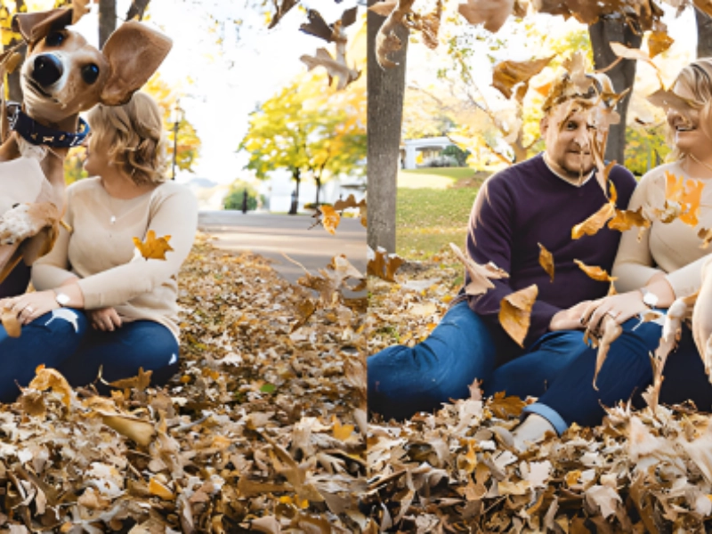 このカップルが婚約したとき、彼らの小さなダックスフントがおしゃれに写り込みました。彼は背景にいるはずだったのに、主役になりたかったのです。もしかしたら芸術的な趣きのために葉を追加していたのかもしれません。いずれにせよ、彼は注目を集めました。