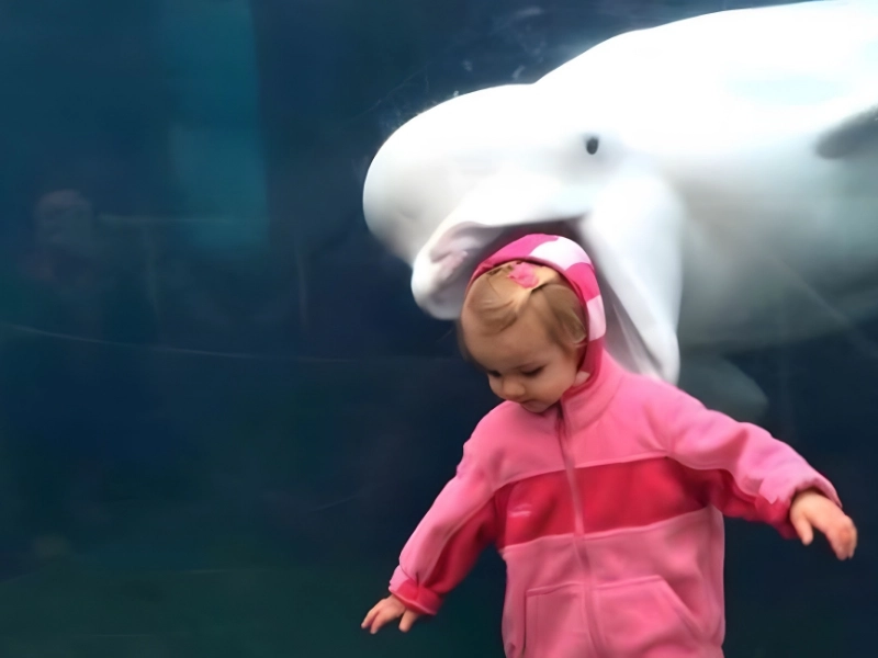 このイルカはおやつを楽しみにしているようで、子供は幸せにも気づいていません。幸い、厚いガラスが彼らを隔てています。