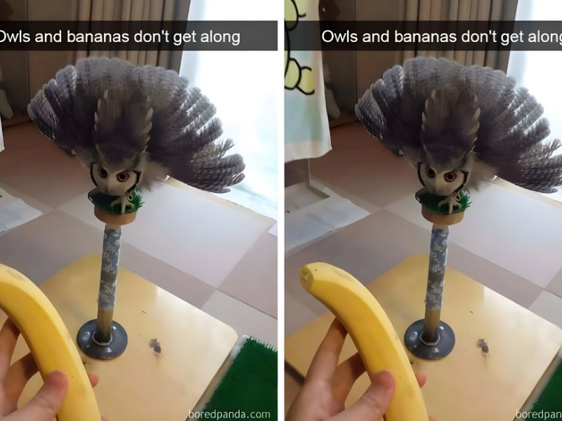 おかしな展開で、このフクロウはバナナに威嚇されているように見え、追い払おうと羽毛を逆立てています。時に、ちょっとしたユーモアが捕食者の羽毛を逆立たせることもあるのです。