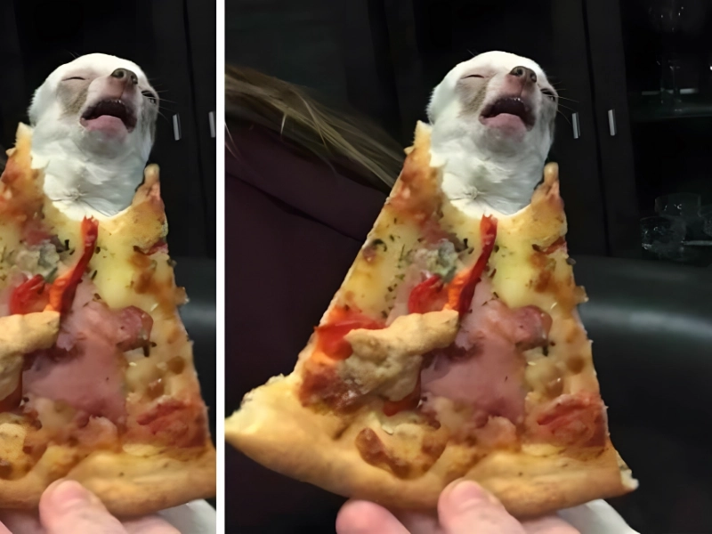 この面白い写真は、おそらくスマートフォンで撮影されたもので、一口かじられたピザのスライスにチワワの顔が完璧に配置されています。犬の表情は最高です―幸せそう、悲しそう、またはただ一口欲しがっているように見えます。