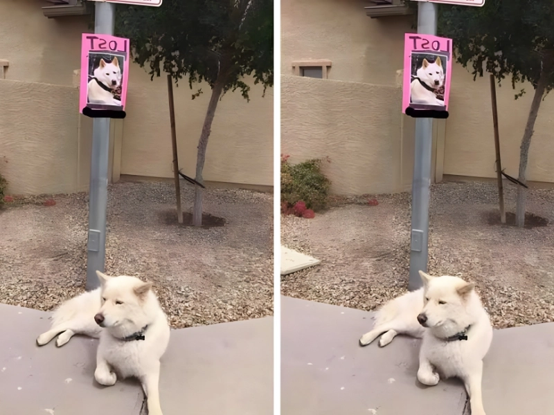このふわふわの犬は迷子ではありません―ただ家に帰りたくないだけです。自分自身の「迷子」ポスターの下でのんびりして、まったく気にしていないようです。