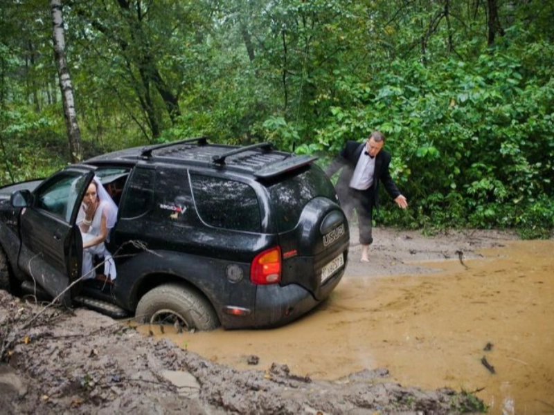 そうだね、車を押す時間だ!このような予期しない挑戦は、結婚式の日を冒険に変え、忘れることが不可能な思い出を作り出します。