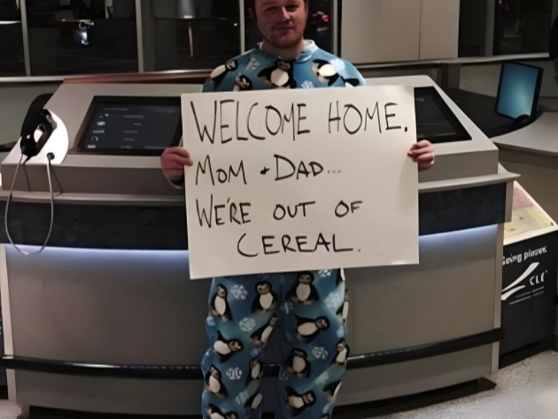 Die meisten Menschen begrüßen Freunde oder Familie nach einer Reise mit einem standardmäßigen "Willkommen zu Hause"-Schild, aber manche werden kreativ. Seien wir ehrlich: Wir alle kennen die Frustration, wenn zu Hause kein Essen mehr da ist und niemand den Kühlschrank auffüllt. Dieser Sohn trieb die Idee auf die Spitze und erschien am Flughafen mit einem Schild, das auflistete, welche Lebensmittel aufgegessen waren, und einem Pinguin-Overall.