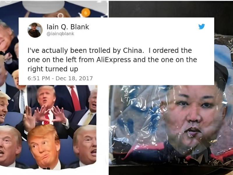 Kosten: 5–10 $*; Hersteller: Unbekannt Gekauft bei: AliExpress Iain Q. Blank berichtet auf Twitter von einer bösen Überraschung. Statt des erwarteten T-Shirts mit einem bekannten US-Politiker erhielt er eines mit dem strengen Konterfei des nordkoreanischen Machthabers Kim Jong Un – ein klassischer Fall von „Bait-and-Switch“.