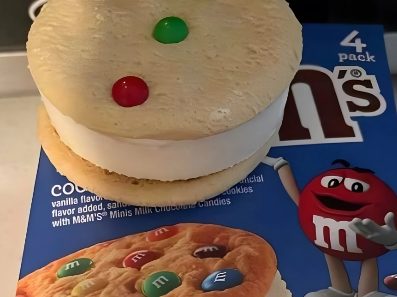 Auch wenn dies nicht der Bestellung entsprach, wird dieser süße Snack den gewünschten Zuckerschub wohl liefern. Die Verpackung des M&M Eis-Sandwiches verspricht deutlich mehr.