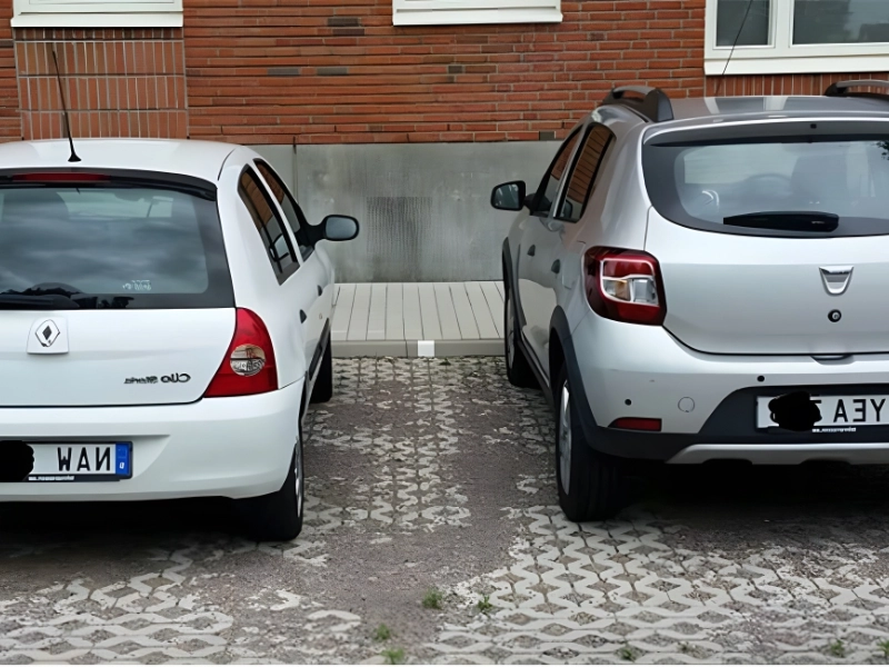 Jemand betrat einen Parkplatz und sah etwas, das ihn sofort zum Fotografieren veranlasste. Es wirkte seltsam, weil die Nummernschilder der beiden nebeneinander geparkten Autos genau gegensätzlich zueinander waren.