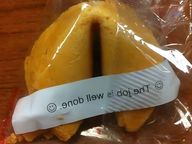 Der Fehler war nicht nur höchst amüsant, sondern die Botschaft war bereits sichtbar, bevor der Keks überhaupt geöffnet wurde. Während der Zettel die Person für eine gut gemachte Arbeit lobt, versagte derjenige, der diesen Keks verpackte, bei seiner einzigen Aufgabe – die Nachricht sicher in der Kekshülle zu verbergen.